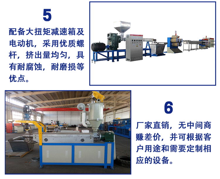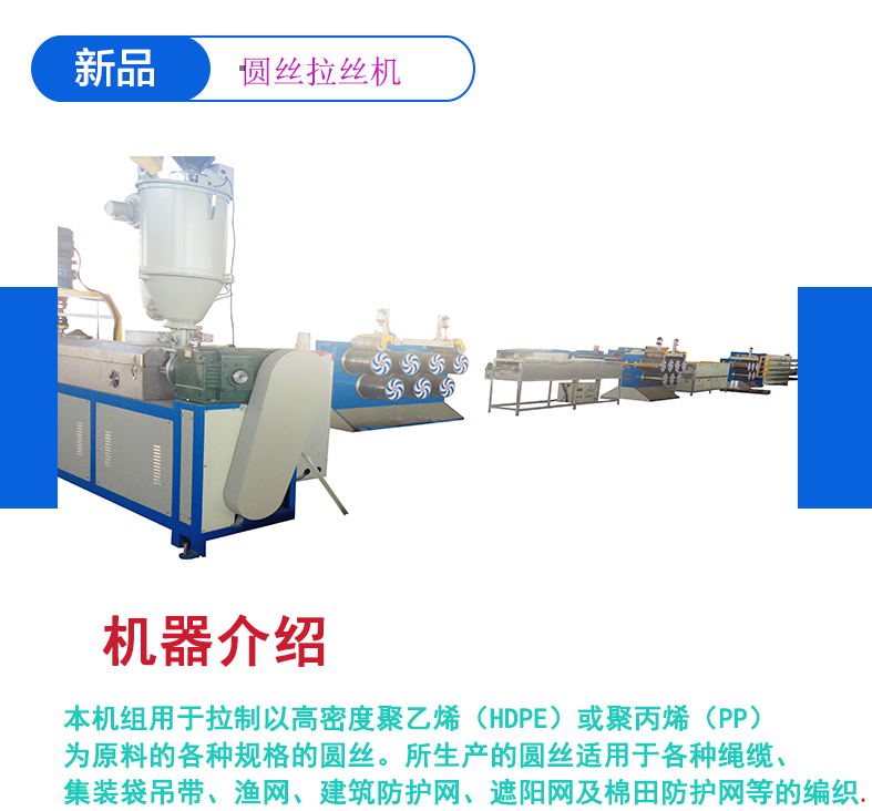 本机组是以聚丙烯(PP),高密度聚乙烯(HDPE)为原料制成各种规格 的圆丝,通过相应调整可用于其他塑料丝加工。